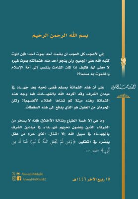 حذر أحمد بن حمد الخليلي المفتي العام لسلطنة عمان من الشماتة بالموت قائلا “لا يسخر من الشرفاء الذين يقضون نحبهم شهـ.ـداء في ميادين الشرف بالجهـ.ـاد في سبيل الله إلا النذل، الذي حرم من عقل يبَصِّره في التفكير، (وَمَن لَّمْ يَجْعَلِ اللَّهُ لَهُ نُورًا فَمَا لَهُ مِن نُّورٍ)..