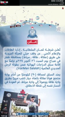 تُعلن شرطة عُمان السلطانية ـ إدارة العلاقات والإعلام الأمني ـ عن وقف جزئي للحركة المرورية على طريق (صلالة ـ طاقة ـ مرباط) بمحافظة ظفار في صباح يوم السبت 26 أكتوبر 2024م تزامنًا مع إقامة سباق الدراجات الهوائية ضمن بطولة الرجل الحديدي العالمية (IronMan Salalah).