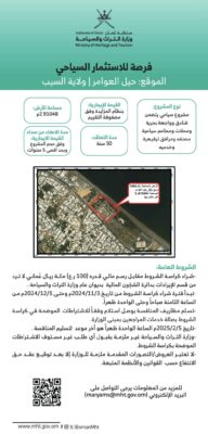 أعلنت وزارة التراث والسياحة عن طرح ثلاث فرص استثمارية في محافظة مسقط، وتحديدًا في ولايتي بوشر والسيب.