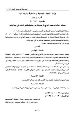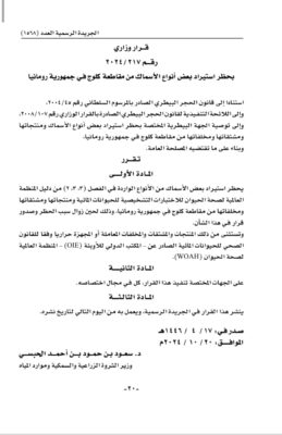 أصدرت وزارة الثروة الزراعية والسمكية وموارد المياه قرار وزاري رقم ٢١٦ / ٢٠٢٤ بحظر استيراد بعض أنواع الرخويات من مقاطعة نورثلاند في نيوزيلندا وقرار رقم ٢١٧ / ٢٠٢٤ بحظر استيراد بعض أنواع الأسماك من مقاطعة كلوج في جمهورية رومانيا.