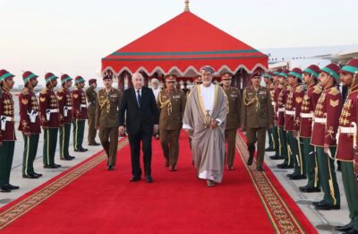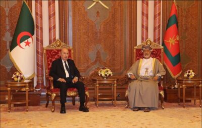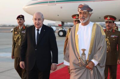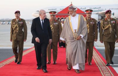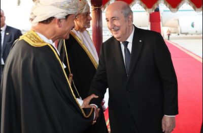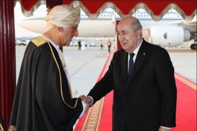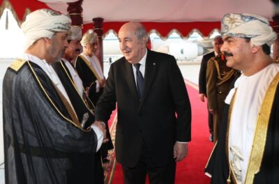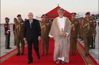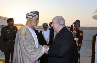 تقدم جلالةُ السُّلطان المعظم /حفظهُ الله ورعاهُ/  لاستقبال فخامة الرئيس الجزائري حيث كان في مقدّمة مستقبلي فخامته عند سُلّم الطائرة لدى وصوله المطار السُّلطاني الخاصّ، في زيارة “دولة” إلى ‎سلطنة عُمان تستغرق ثلاثة أيام.