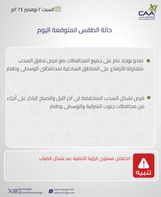 وهج الخليج ـ مسقط ذكرت الأرصاد الجوية العمانية عبر حسابها الرسمي على منصة اكس حالة الطقس المتوقعة اليوم كما هو موضح أدناه