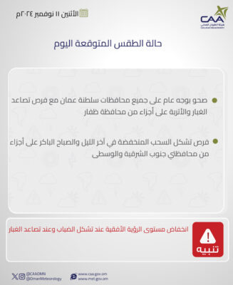 نشرت الأرصاد الجوية العمانية عبر حسابها الرسمي على منصة اكس حالة الطقس اليوم كما هو موضح أدناه