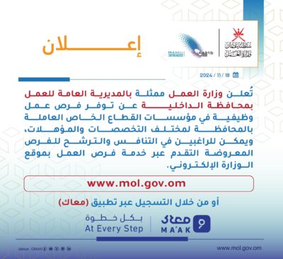 فرص عمل وظيفية بمحافظة الداخلية .. إليك رابط التسجيل