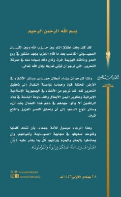 وأضاف الخليلي، وإننا لنرجو أن يزداد أبطال حماس وسائر الأشقاء في الأرض المحتلة قوة وحماسا لمواصلة النضال إلى تحقيق التحرير كله، كما نرجو من الأشقاء في الجمهورية الإسلامية الإيرانية ومغاوير اليمن الأبطال والمقاومة الباسلة في بلاد الرافدين ألا يألوا جهدهم في دعم هذا النضال بشد أزره وسائر أنواع الدعم؛ إلى أن يتحقق النصر العزيز والفتح