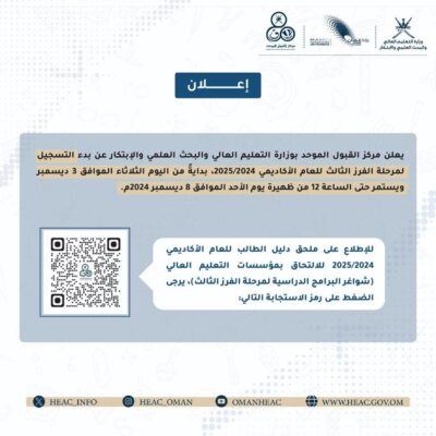 اعلن مركز القبول الموحد بوزارة التعليم العالي والبحث العلمي والإبتكار عن بدء التسجيل لمرحلة الفرز الثالث للعام الأكاديمي 2025/2024، بدايةً من اليوم الثلاثاء الموافق 3 ديسمبر ويستمر حتى الساعة 12 من ظهيرة يوم الأحد الموافق 8 ديسمبر 2024م.