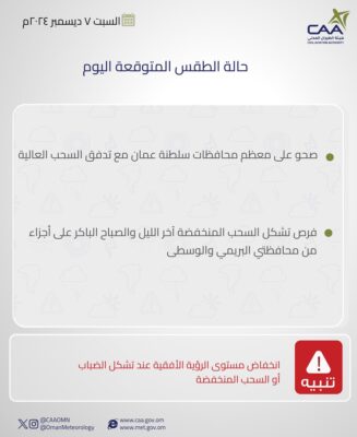 نشرت الأرصاد الجوية العمانية عبر حسابها الرسمي على منصة اكس حالة الطقس المتوقعة اليوم كما هو موضح أدناه