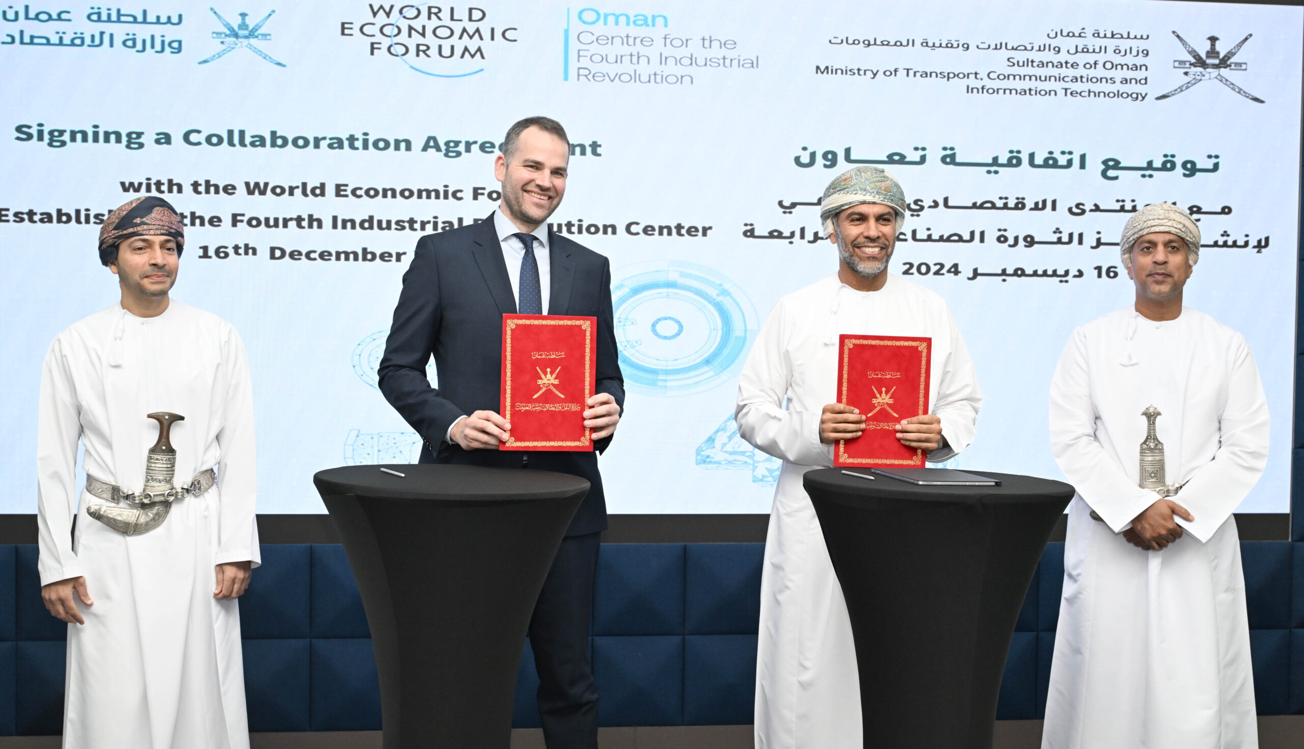 وقد وقع الاتفاقية عن وزارة النقل والاتصالات وتقنية المعلومات سعادة الدكتور علي بن عامر الشيذاني وكيل وزارة النقل والاتصالات وتقنية المعلومات للاتصالات وتقنية المعلومات، فيما وقعها من جانب المنتدى الاقتصادي العالمي سيباستيان بوكاب رئيس الشبكات والشراكات وعضو اللجنة التنفيذية بالمنتدى الاقتصادي العالمي.