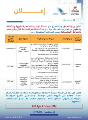 أعلنت وزارة العمل وبالتنسيق مع اللجنة الوطنية العمانية للتربية والثقافة والعلوم عن توفر وظائف شاغرة لدى منظمة الأمم المتحدة للتربية والعلم والثقافة (اليونسكو) للاطلاع والتسجيل من خلال الرابط الآتي: