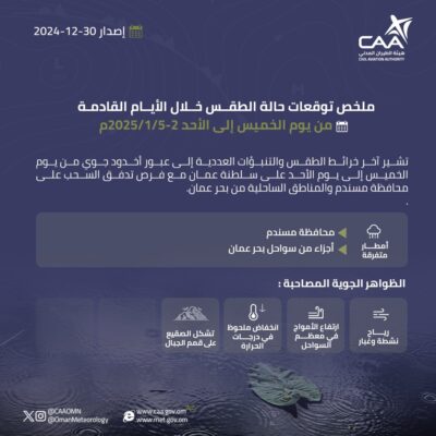 تشير آخر خرائط الطقس والتنبؤات العددية إلى عبور أخدود جوي من يوم الخميس إلى يوم الأحد على سلطنة عمان مع فرص تدفق السحب على محافظة مسندم والمناطق الساحلية من بحر عمان