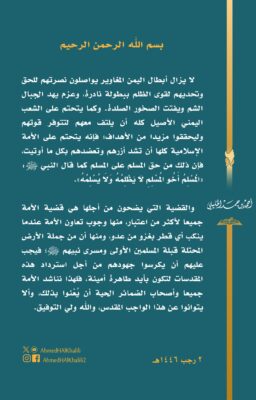 واضاف الخليلي “والقضية التي يضحون من أجلها هي قضية الأمة جميعا لأكثر من اعتبار، منها وجوب تعاون الأمة عندما ينكب أي قطر بغزو من عدو، ومنها أن من جملة الأرض المحتلة قبلة المسلمين الأولى ومسرى نبيهم ؛ فيجب عليهم أن يكرسوا جهودهم من أجل استرداد هذه المقدسات لتكون بأيد طاهرة أمينة فلهذا نناشد الأمة جميعا وأصحاب الضمائر الحية أن يُعنوا بذلك، وألا يتوانوا عن هذا الواجب المقدس، والله ولي التوفيق”