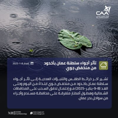 ذكرت الأرصاد الجوية العمانية أنه تأثر أجواء سلطنة عمان بأخدود من منخفض جوي من اليوم وحتى الغد.