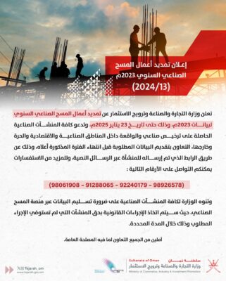 تعلن وزارة التجارة والصناعة وترويج الاستثمار عن تمديد أعمال المسح الصَّناعي السنوي لبيانات 2023م حتى تاريخ 23 يناير 2025م، وتدعو كافة المنشآت الصناعية الحاصلة على ترخيص صّناعي والواقعة داخل المناطق الصّناعية والاقتصادية والحرة وخارجها؛ بتقديم البيانات المطلوبة قبل انتهاء الفترة المحددة.