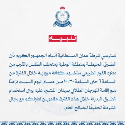 تسترعي شرطة عمان السلطانية انتباه الجمهور الكريم بأن الطرق المحيطة بمنطقة الوطية ومتحف الطفل بالقرب من متنزه القرم الطبيعي ستشهد كثافة مرورية خلال الفترة من الساعة ٦ حتى الساعة ١٠:٣٠ من مساء اليوم السبت تزامنًا مع إقامة المهرجان الطلابي بميدان الفتح..