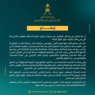 توضيح حول ما يتداول بشأن رسوم دخول جامع السلطان قابوس الأكبر .. إليك التفاصيل