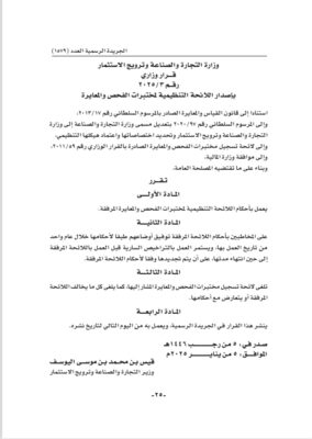 و قرار وزاري رقم ٣ / ٢٠٢٥بإصدار اللائحة التنظيمية لمختبرات الفحص والمعايرة.،