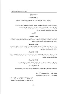 أصدرت وزارة التجارة والصناعة وترويج الاستثمار قرار وزاري رقم ٥ / ٢٠٢٥ بإصدار مبادئ حوكمة الشركات التجارية المساهمة المقفلة.