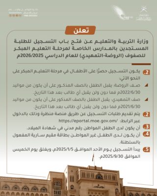 أعلنت وزارة التربية والتعليم عن فتح باب التسجيل للطلبة المستجدين بالمدارس الخاصة لمرحلة التعليم المبكر للصفوف (الروضة – التمهيدي) للعام الدراسي 2025-2026 وفق الشروط الموضحة ادناه :