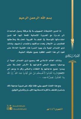 واضاف نناشد العالم الإسلامي كله وجميع ذوي الضمائر الحية أن يواصلوا دعمهم السخي لإخوانهم في الأرض المحتلة حتى يسدوا جميع حاجاتهم في النفقات والسكنى وكل ما يدعو إلى الإنفاق ﴿ وَمَا تُقَدِّمُوا لِأَنفُسِكُم مِّنْ خَيْرٍ تَجِدُوهُ عِندَ اللَّهِ إِنَّ اللَّهَ
