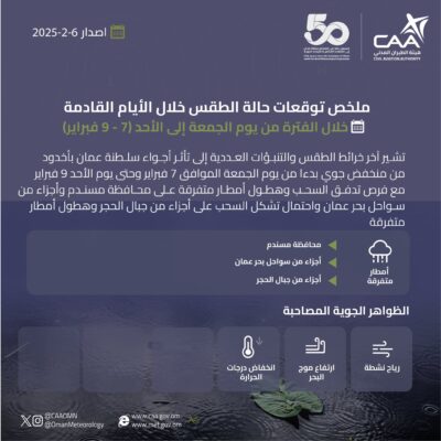 تشـير آخر خرائط الطقس والتنبـؤات العـددية إلى تأثـر أجـواء سلـطنة عمان بأخدود من منخفض جوي بدءا من يوم الجمعة الموافق 7 فبراير وحتى يوم الأحد 9 فبراير