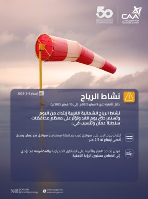 وهج الخليج ـ مسقط حذرت الأرصاد الجوية العمانية من نشاط الرياح الشمالية الغربية ابتداء من مساء اليوم الأحد وتستمر ليوم الغد تؤثر على معظم محافظات سلطنة عمان