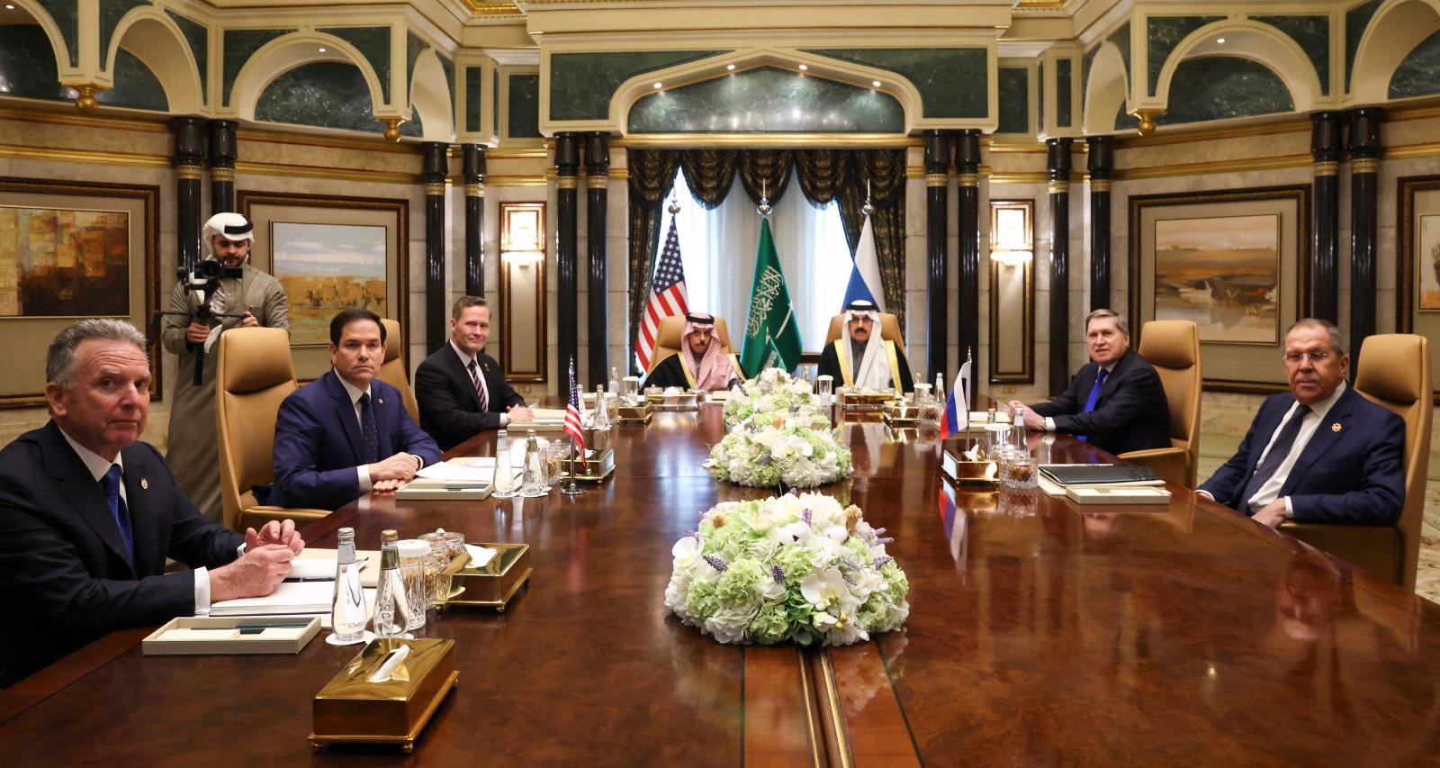 في مواجهة واحدهما الآخر، جلس وزير الخارجية الأميركي ماركو روبيو ونظيره الروسي سيرغي لافروف حول طاولة كبيرة من خشب الماهوجني، وتفصل بينهما باقات كبيرة من الزهور البيضاء، ويقودان وفديهما.
