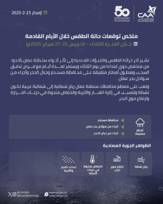 أفادت الارصاد الجوية العمانية بشأن تأثر أجواء سلطنة عمان بأخدود من منخفض جوي ابتداءا من يوم الثلاثاء ويستمر لعدة أيام مع فرص تدفق السحب وهطول أمطار متفرقة على محافظة مسندم وجبال الحجر وأجزاء من سواحل بحر عمان.