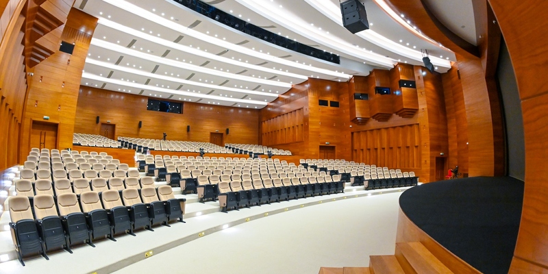 وزُوّد المسرح الذي يتّسع لـ 500 شخص على مساحة تبلغ 560 مترًا مربّعًا بأحدث التّجهيزات والتّقنيات التي تساعد على إخراج الفعاليّات والمناسبات والعروض المقامة على خشبته التي تبلغ مساحتها 150 مترًا مربّعًا في أحسن صورة، ويتضمن غُرفًا خاصة للتّعليق والتّرجمة والتّحكّم والنّقل الخارجي.