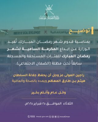 أوضحت وزارة التنمية الاجتماعية أنه بمناسبة قدوم شهر رمضان الـمبارك؛ ستم بإيداع الـمكرمة السـامية المُخصصة لمـستحقيها من فئة (الضمان الاجتماعي سابقاً).