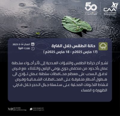 تشير آخر خرائط الطقس والتنبؤات العددية إلى تأثر أجواء سلطنة عمان بأخدود من منخفض جوي يومي الإثنين والثلاثاء مع فرص تدفق السحب على معظم محافظات سلطنة عمان تؤدي الى هطول أمطار متفرقة على المحافظات الشمالية وفرص لنشاط التكونات المحلية على سلسلة جبال الحجر خلال فترتي الظهيرة و المساء