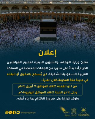 أعلنت وزارة الأوقاف والشؤون الدينية لعموم المواطنين الكرام أنه بناءً على ما ورد من الجهات المختصة في المملكة العربية السعودية الشقيقة، لن يُسمح بالدخول أو البقاء