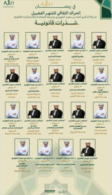 مع حلول شهر رمضان المبارك ، شهر الخير والعطاء، أطلقت شركة الدكتور أحمد بن سعيد الجهوري وشريكه للمحاماة والاستشارات القانونية مبادرة تهدف إلى توعية المجتمع بالقوانين والتشريعات عبر تقديم محاضرات وشذرات قانونية من القرآن الكريم في العديد من المساجد والجوامع بسلطنة عمان.