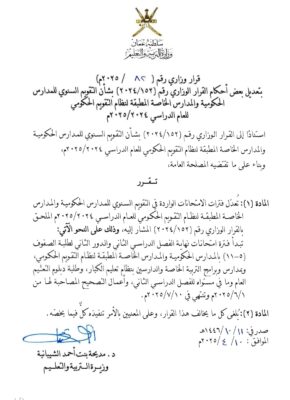 أصدرت وزارة التربية والتعليم قرار وزاري رقم ( ٨٢ / ٢٠٢٥م) بتعديل بعض أحكام القرار الوزاري رقم (٢٠٢٤/١٥٢) بشأن التقويم السنوي للمدارس الحكومية والمدارس الخاصة المطبقة لنظام التقويم الحكومي للعام الدراسي ٢٠٢٥/٢٠٢٤م