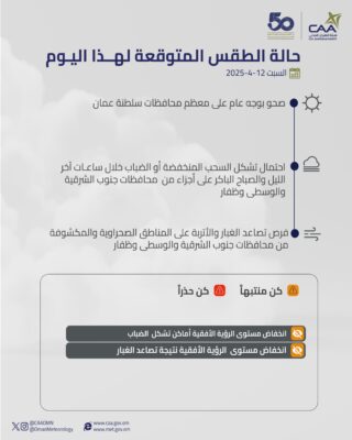 وهج الخليج ـ مسقط ذكرت الأرصاد الجوية العمانية عبر حسابها الرسمي على منصة اكس حالة الطقس المتوقعة اليوم كما هو موضح أدناه