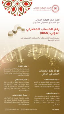 وقد قام البنك المركزي العُماني بتطبيق رقم الحساب المصرفي الدولي (IBAN) على التحويلات المالية الدولية منذ 31 مارس 2024م، وهو معيار عالمي لتحديد أرقام الحسابات المصرفية عبرالحدود الوطنية.