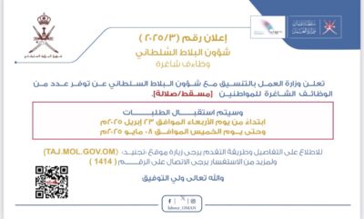 تُعلن ⁧‫وزارة العمل‬⁩ بالتنسيق مع شؤون البلاط السلطاني ⁦‪عن فتح باب التوظيف لعدد من الوظائف الشاغرة بـ(مسقط، صلالة)، ابتداءً من اليوم الأربعاء ، وحتى يوم الخميس الموافق 8 مايو 2025م.