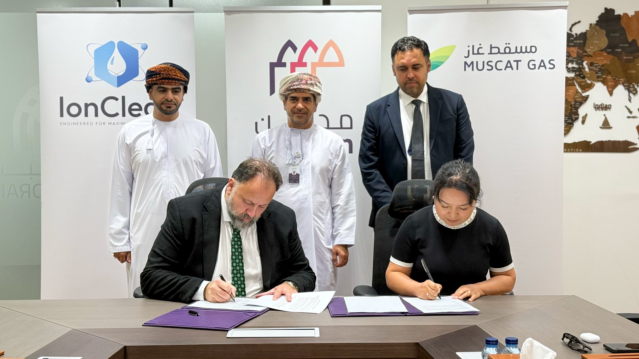 وقعت شركة مسقط للغازات مذكرة تفاهم مع شركة IonClear الأمريكية، التي تتخذ من وادي السيليكون بكاليفورنيا مقرًا لها، لإنشاء أول مصنع لأغشية معالجة وتحلية المياه في سلطنة عمان.