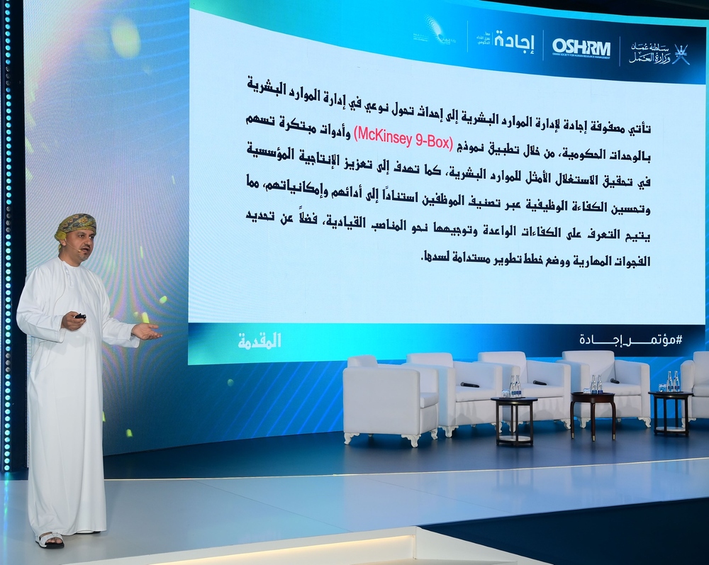 وقدم الدكتور محمد بن مصطفى النجار مدير عام التدريب بوزارة العمل خلال أعمال المؤتمر ورقة عمل بعنوان / مصفوفة إجادة لإدارة الموارد البشرية / وضح فيها أن المصفوفة تسعى إلى إحداث حول نوعي في إدارة الموارد البشرية بالوحدات الحكومية من خلال تطبيق Mc Kinsey 9-Box وأدوات مبتكرة تسهم في تحقيق الاستغلال الأمثل للموارد البشري.