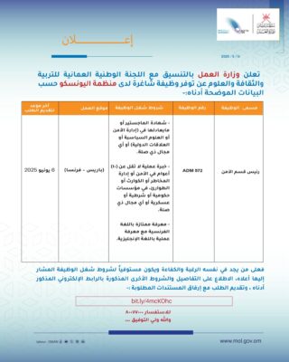 تعلن وزارة العمل وبالتنسيق مع اللجنة الوطنية العمانية للتربية والثقافة والعلوم عن توفر فرصة وظيفة شاغرة لدى منظمة( اليونسكو )