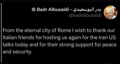 قال معالي السيد بدر البوسعيدي وزير الخارجية عبر حسابه الرسمي بموقع التواصل الاجتماعي ” اكس ” : الجولة الخامسة من المحادثات الإيرانية الأميركية اختتمت مع بعض التقدم ولكن ليس حاسماً، نأمل في بحث القضايا المتبقية بين إيران وأميركا في الأيام المقبلة.