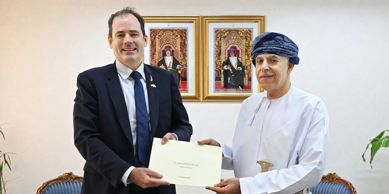 تسلّم سعادة الشيخ خالد بن هاشل المصلحي وكيل وزارة الخارجية للشؤون الإدارية والمالية اليوم نسخة من أوراق اعتماد سعادة تشارلز تريفيليان كينغستون سفير نيوزيلندا المعيّن لدى سلطنة عُمان.