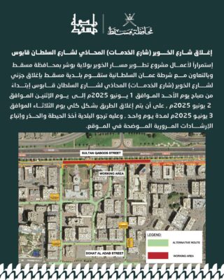 استمراراً لأعمال مشروع تطوير مسار الخوير بولاية بوشر، وبالتعاون مع شرطة عمان السلطانية، تُعلن #بلدية_مسقط عن إغلاق جزئي لشارع الخوير (شارع الخدمات) من 1 إلى 2 يونيو، وإغلاق كلي في 3 يونيو 2025م. يرجى التقيد بالإرشادات المرورية.