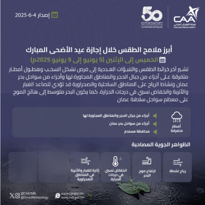 توقعت الأرصاد الجوية العمانية، بناءً على آخر خرائط الطقس والتنبؤات العددية، أن تشهد أجواء سلطنة عمان خلال إجازة عيد الأضحى المبارك، من الخميس 5 يونيو وحتى الإثنين 9 يونيو 2025، حالة من عدم الاستقرار الجوي.