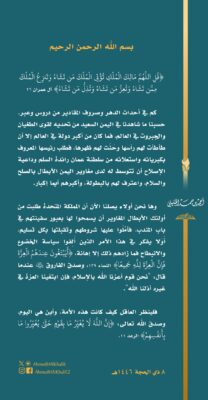 واستشهد الخليلي بقول الله تعالى: “قُلِ اللَّهُمَّ مَالِكَ الْمُلْكِ… (آل عمران: 26)”، مبينًا أن الأيام تكشف كيف أن الله يرفع أقوامًا ويضع آخرين.