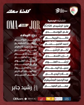 نشر الاتحاد العماني لكرة القدم تشكيل منتخبنا الوطني في مباراة اليوم أمام نظيره الأردني ضمن الجولة التاسعة من التصفيات الآسيوية المؤهلة إلى نهائيات كأس العالم 2026 بـ #أميركا و #كندا و #المكسيك ، في تمام الساعة الثامنة مساءً على مجمع السلطان قابوس الرياضي بـ #بوشر.