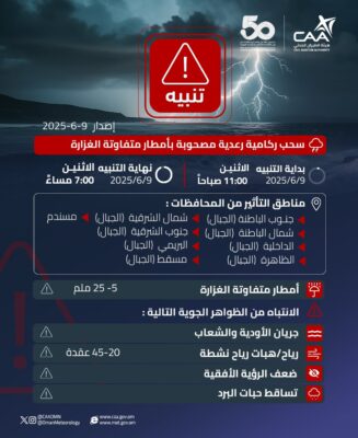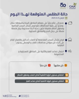 وأشارت الهيئة،إلى احتمالية هطول أمطار متفاوتة الغزارة على سلسلة جبال الحجر ومحافظة مسندم، قد يصاحبها نشاط في السحب الركامية. كما حذّرت من تساقط حبات البَرَد، ورياح هابطة نشطة قد تؤدي إلى تدنٍ في مستوى الرؤية الأفقية وتطاير الأجسام غير المثبتة.