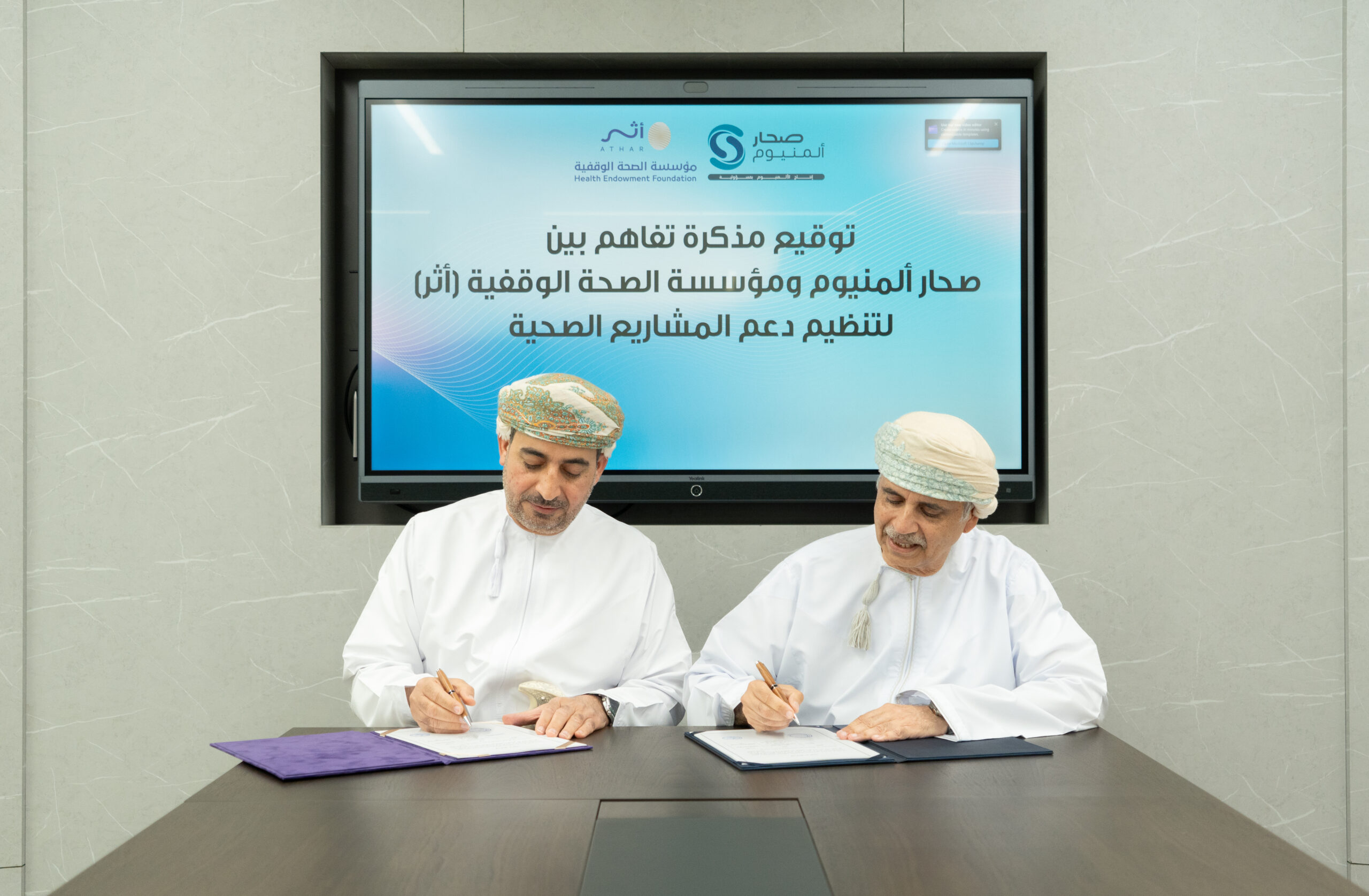 وقّعت شركة صحار ألمنيوم مذكرة تفاهم مع مؤسسة الصحة الوقفية (أثر)، بهدف توحيد الجهود لدعم المبادرات والمشروعات الصحية ذات الأولوية في سلطنة عُمان، وذلك في إطار حرص الطرفين على تعزيز استدامة الخدمات والمشاريع الصحية والمساهمة الفاعلة في تطوير القطاع الصحي بالسلطنة.