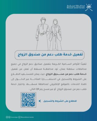 تنفيذا للأوامر السامية الكريمة بتفعيل صناديق دعم الزواج في جميع محافظات سلطنة عمان تود محافظة مسقط أن تعلن عن تفعيل خدمة طلب دعم من صندوق الزواج، حيث يمكن للمستفيد الاطلاع على الشروط والتسجيل في الاستمارة المتاحة عبر الدخول إلى نافذة الخدمات بالموقع الإلكتروني لمحافظة مسقط