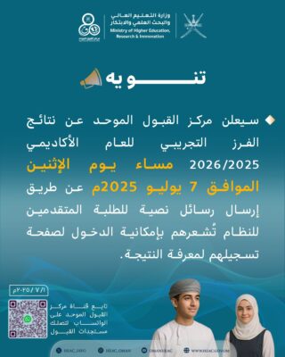 سيعلن مركز القبول الموحد عن نتائج الفرز التجريبي 2026/2025 مساء للعام الأكاديمي يوم الإثنين الموافق 7 يوليو 2025م عن طريق إرسال رسائل نصية للطلبة المتقدمين للنظام تُشعرهم بإمكانية الدخول لصفحة تسجيلهم لمعرفة النتيجة.