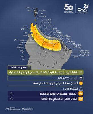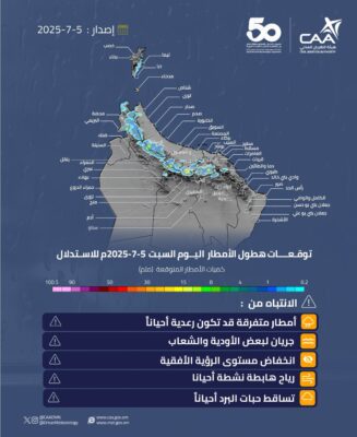 ذكرت الأرصاد الجوية العمانية أن هناك كميات الأمطار المتوقعة اليوم السبت 5 يوليو 2025 وأماكن نشاط الرياح الهابطة المتوقعة استدلالا بالنموذج العددي العماني.